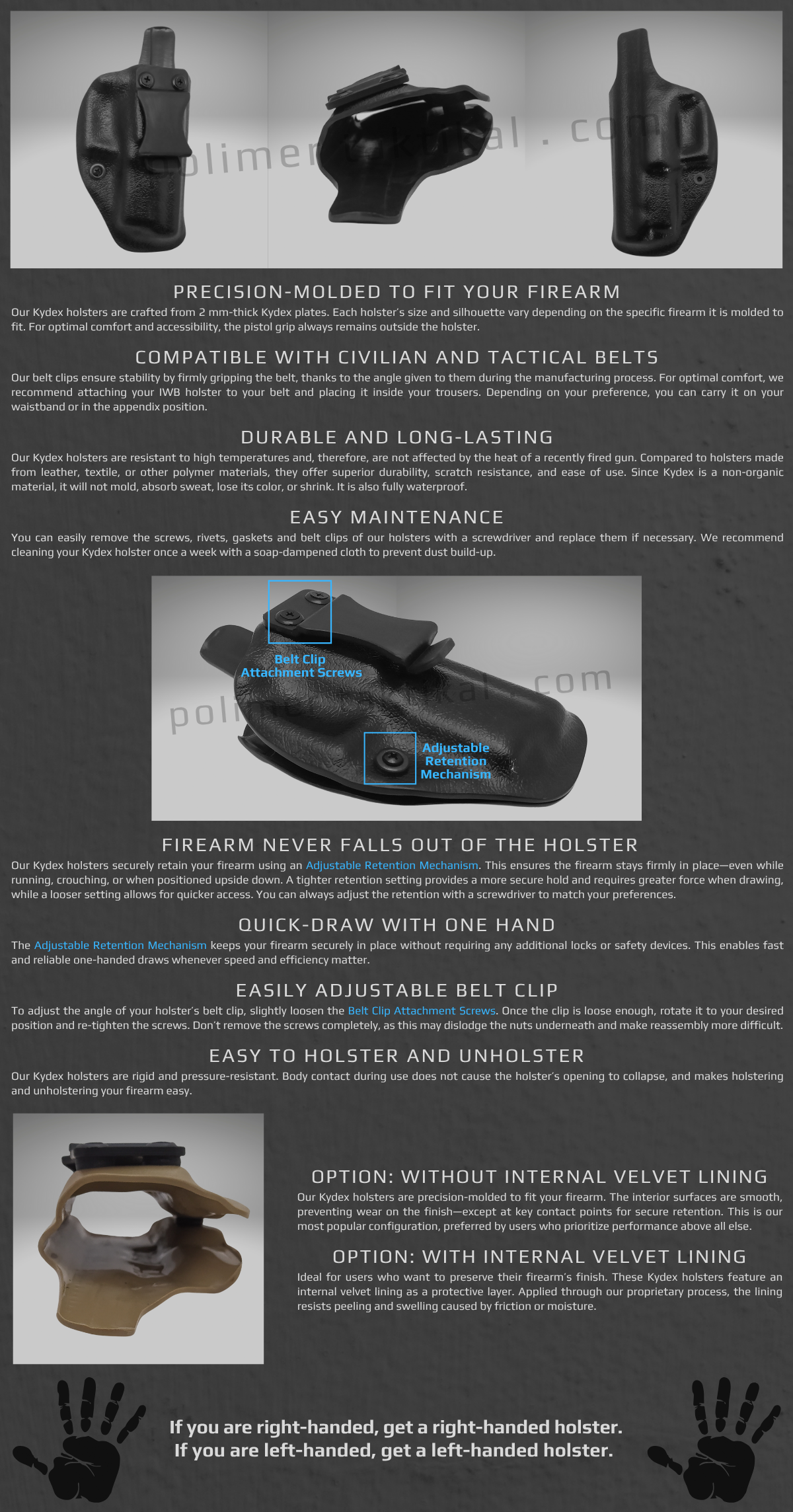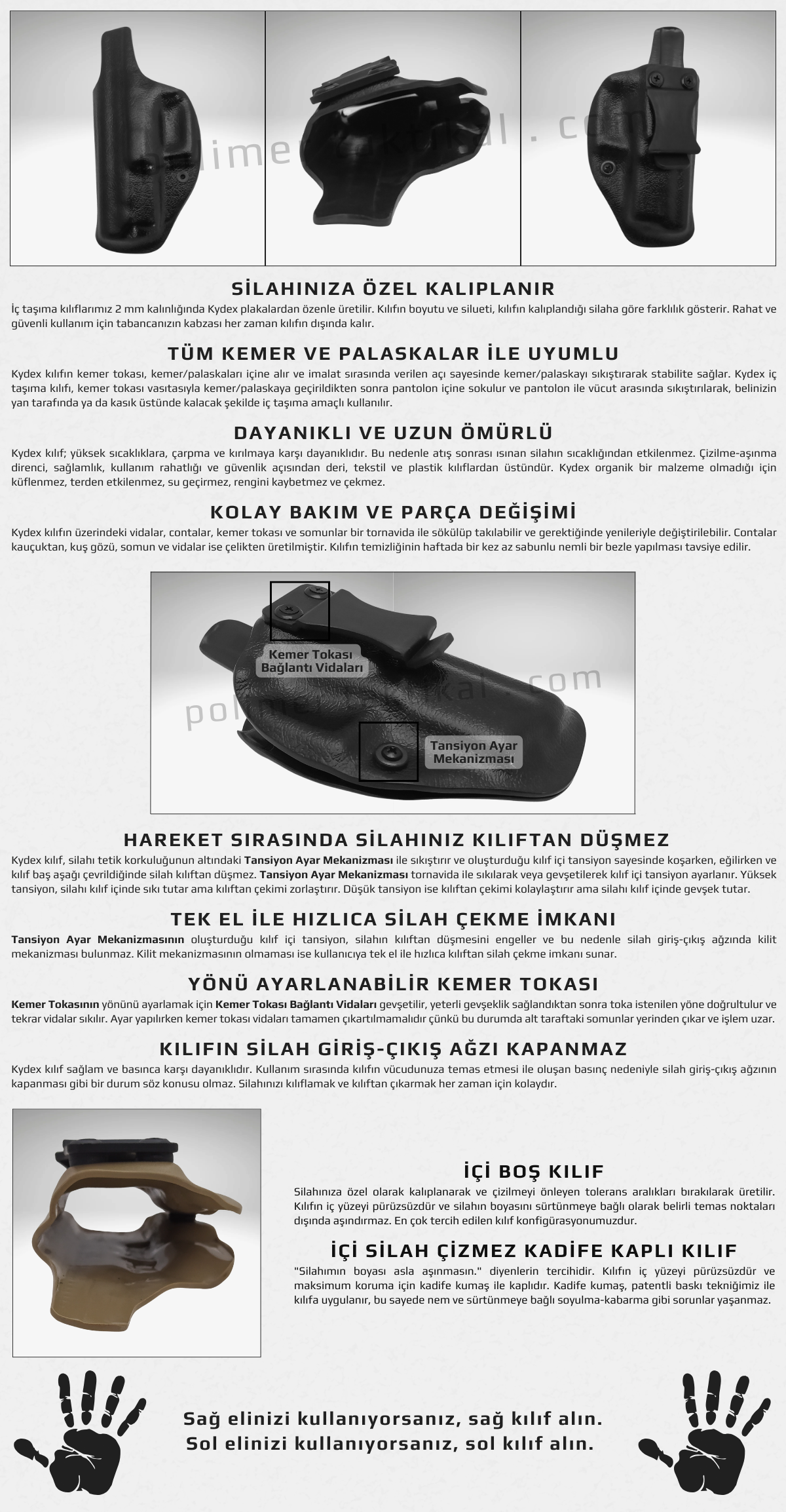 Web sitemizden alışveriş yapan herkes "Kydex Silah Kılıfı Ve Kydex Şarjörlük Güvenlik Talimatları", "İade Ve Garanti Politikası", "Kişisel Veriler Politikası", "Mesafeli Satış Sözleşmesi" ve "Gizlilik Ve Güvenlik" sayfalarındaki metinleri tamamıyla okumuş ve bu metinlere uygun hareket etmeyi kabul etmiş sayılır.