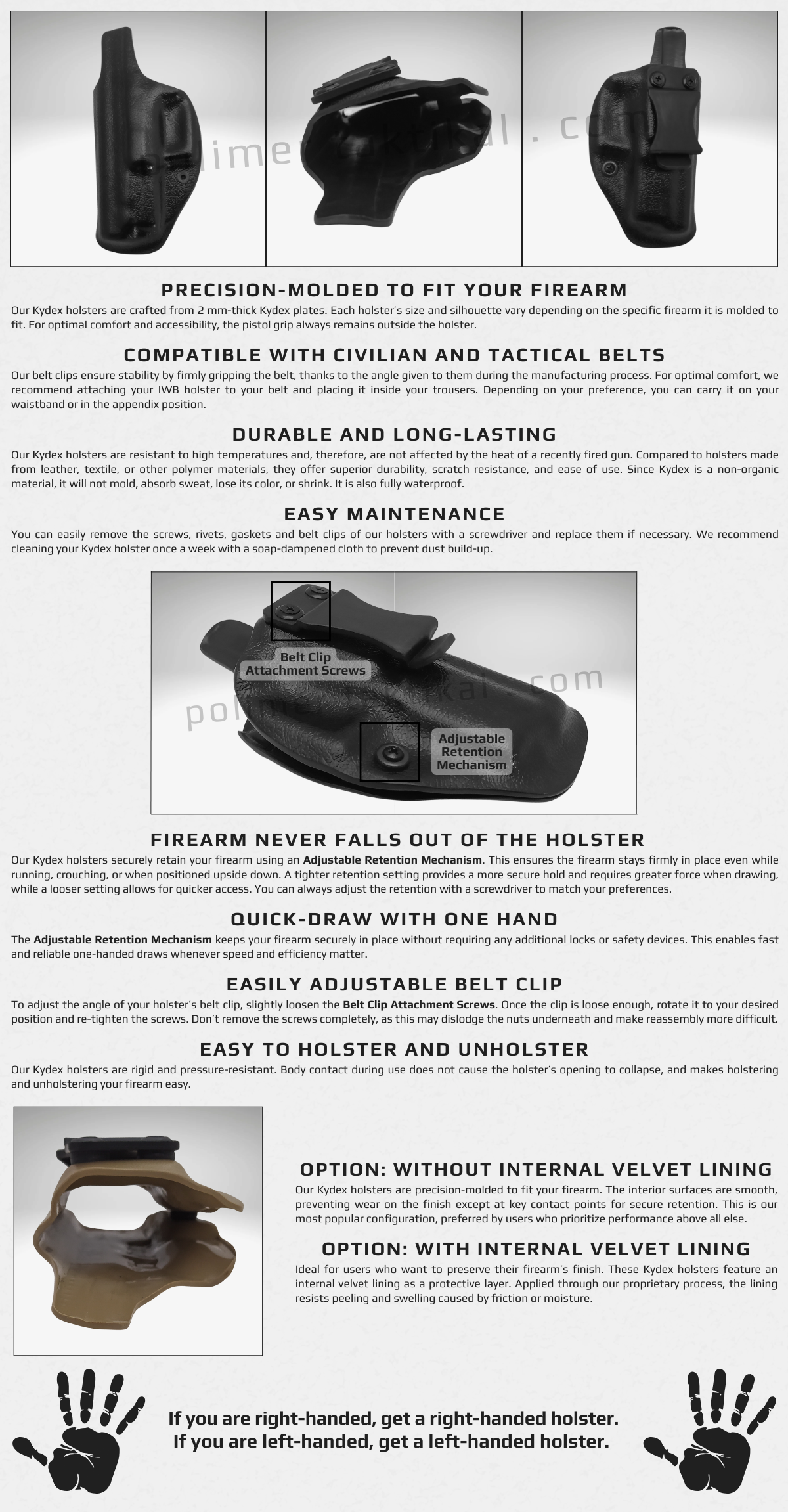 Kydex iç taşıma kılıfı satın alırken silahınıza birebir özel kalıplanmış bir modeli tercih etmelisiniz. Doğru kalıp silahınızı hızlıca çekmenizi sağlarken, hareket halindeyken de kılıftan düşmesini engeller. Polimer Taktikal olarak, her marka ve modele uygun kydex silah kılıfı üretiyor ve sahada taktik üstünlüğe sahip olmanız için size destek oluyoruz.