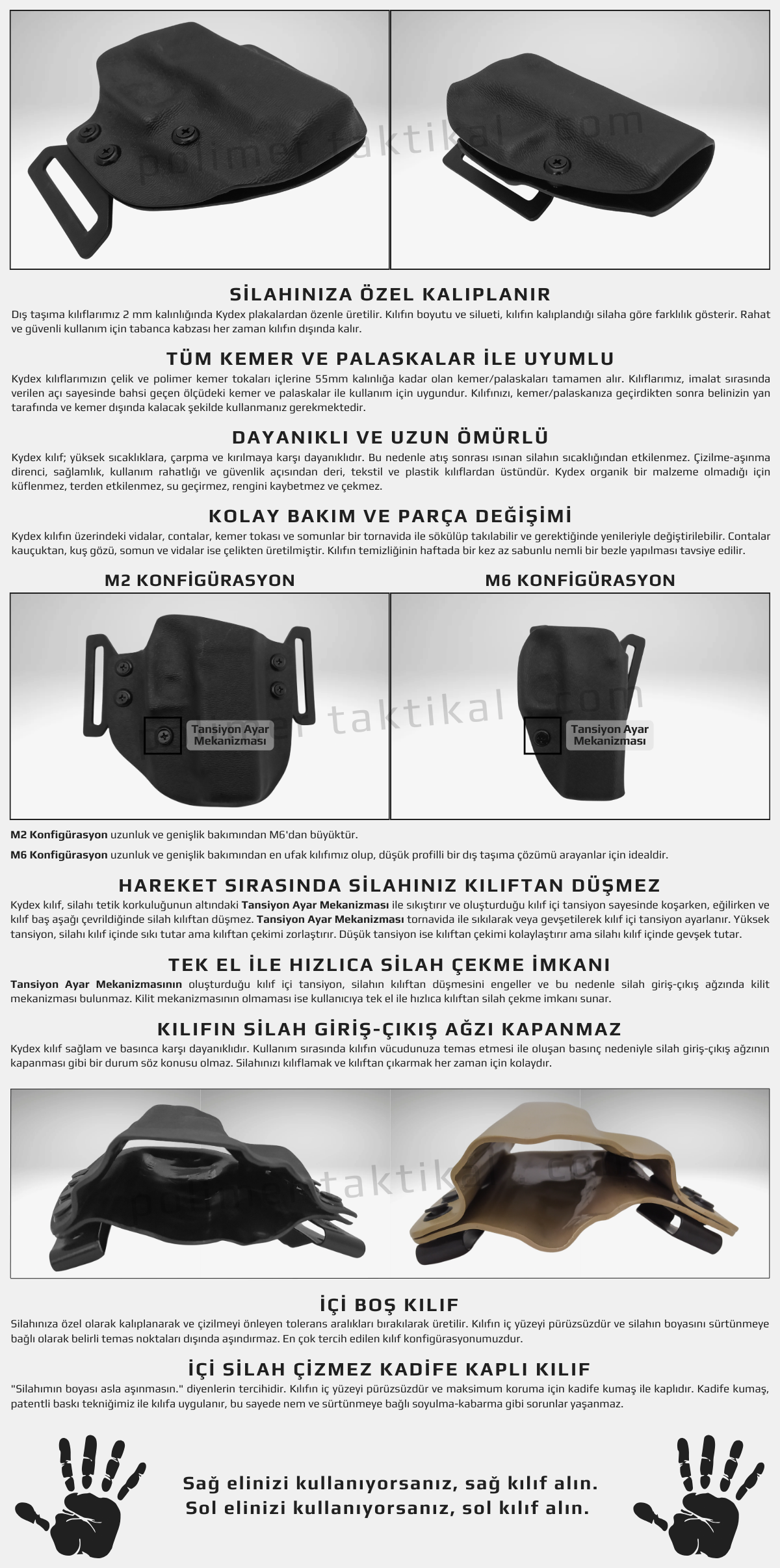 Kydex dış taşıma kılıfı satın alırken silahınıza birebir özel kalıplanmış bir modeli tercih etmelisiniz. Doğru kalıp silahınızı hızlıca çekmenizi sağlarken, hareket halindeyken de kılıftan düşmesini engeller. Polimer Taktikal olarak, her marka ve modele uygun kydex dış kılıf üretiyor ve sahada taktik üstünlüğe sahip olmanız için size destek oluyoruz.