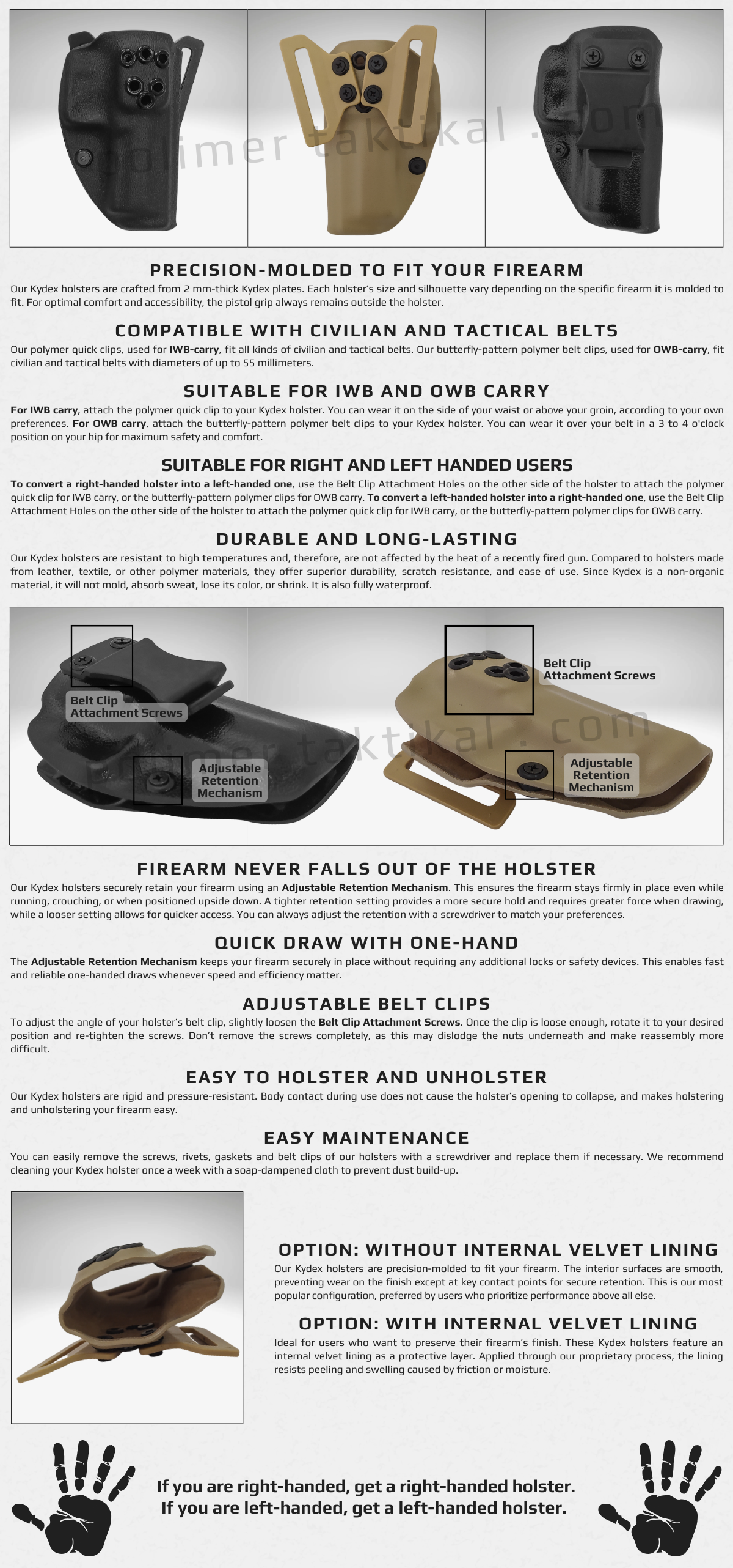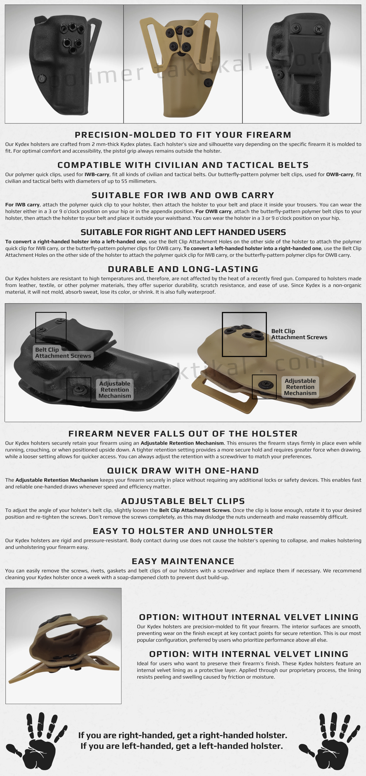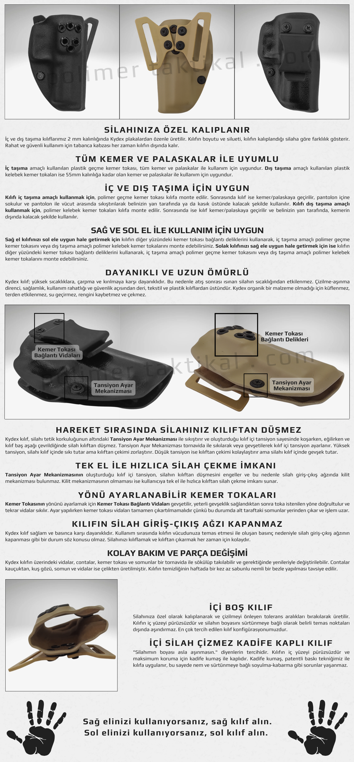 Kydex iç ve dış silah kılıflarımız tüm kemer ve palaskalarla uyumludur. Ayrıca Kydex iç ve dış tabanca kılıflarımız, hareket halindeyken silahın düşmesini engelleyen kilit mekanizmasına sahiptir ve tek hamlede hızlıca silah çekme imkânı sunar. Kydex iç ve dış taktik kılıflarımızın bakım ve parça değişimi son derece kolaydır. “Silahımın asla çizilmesini istemiyorum.” diyenler için içi silah çizmeyen kadife kaplı kydex iç ve dış kılıf modellerimiz mevcuttur.
