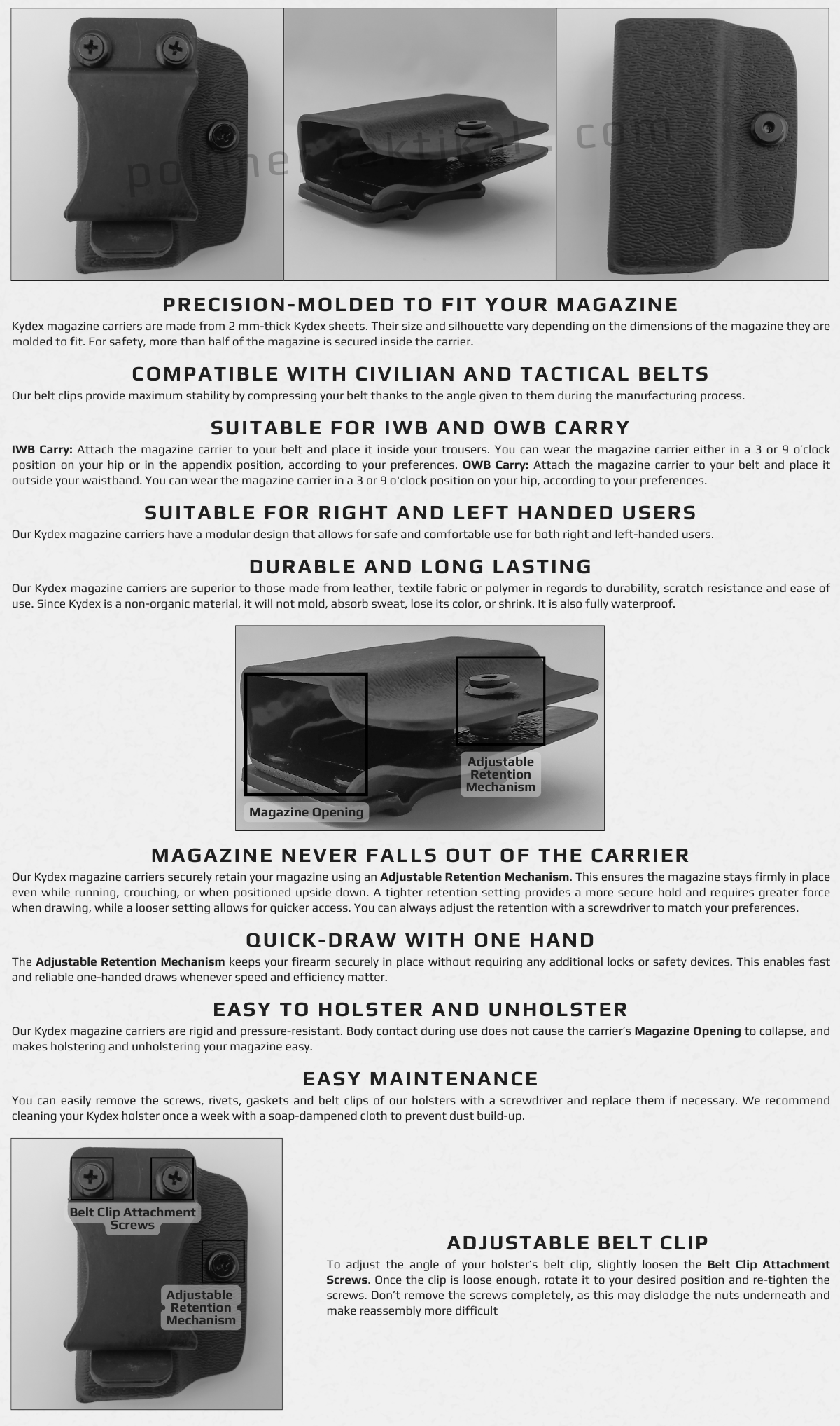 Kydex şarjörlüklerimiz tüm kemer ve palaskalarla uyumludur. Ayrıca Kydex şarjör kılıflarımız, hareket halindeyken şarjörün düşmesini engelleyen kilit mekanizmasına sahiptir ve tek hamlede hızlıca şarjör çekme imkânı sunar. Kydex şarjör kılıflarımızın bakım ve parça değişimi son derece kolaydır.