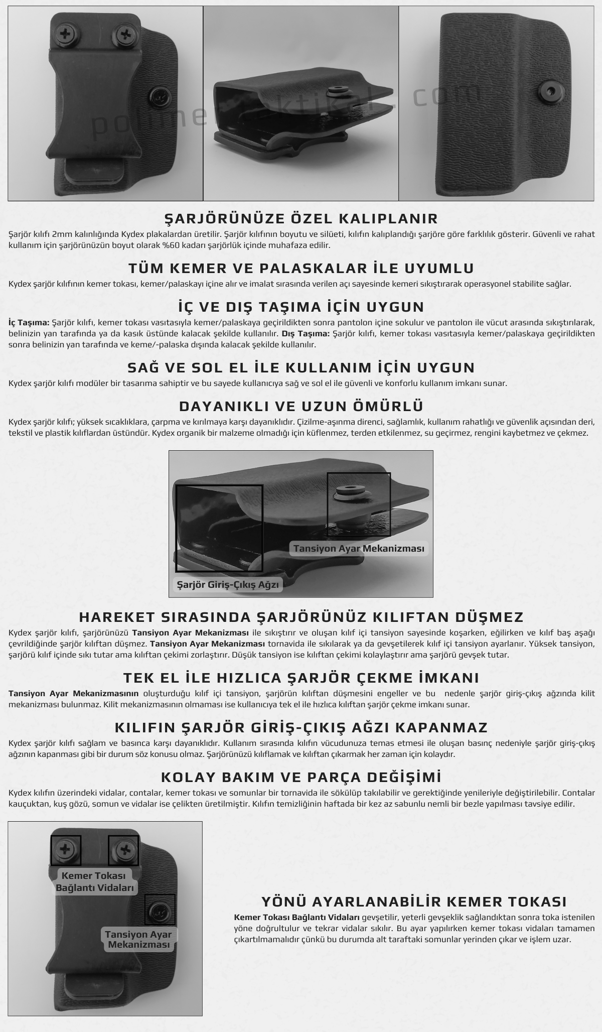 Kydex şarjörlüklerimiz tüm kemer ve palaskalarla uyumludur. Ayrıca Kydex şarjör kılıflarımız, hareket halindeyken şarjörün düşmesini engelleyen kilit mekanizmasına sahiptir ve tek hamlede hızlıca şarjör çekme imkânı sunar. Kydex şarjör kılıflarımızın bakım ve parça değişimi son derece kolaydır.