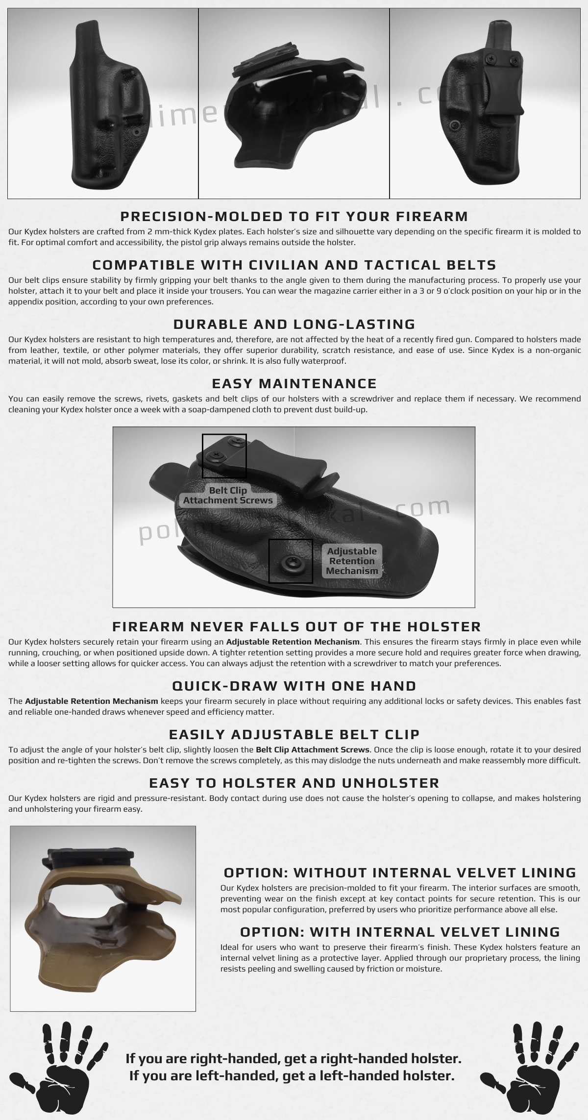 Kydex iç taşıma kılıfı satın alırken silahınıza birebir özel kalıplanmış bir modeli tercih etmelisiniz. Doğru kalıp silahınızı hızlıca çekmenizi sağlarken, hareket halindeyken de kılıftan düşmesini engeller. Polimer Taktikal olarak, her marka ve modele uygun kydex silah kılıfı üretiyor ve sahada taktik üstünlüğe sahip olmanız için size destek oluyoruz.